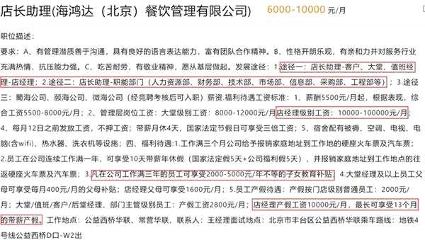 海底撈北京公司在某招聘網(wǎng)站發(fā)布的店長助理招聘信息顯示。店長助理每月起薪為5500元,根據(jù)綜合表現(xiàn)最高可達8000元。大堂級別工資為8000到12000元,店經(jīng)理月薪區(qū)間則在1萬至10萬區(qū)間,即店長待遇最有想象力,月收入最高達10萬元。此外,還有宿舍、交通報銷、父母補貼等多項福利,其中一條福利對女性店經(jīng)理極具誘惑力,店經(jīng)理產(chǎn)假工資為10000元/月,最長可享受13個月的帶薪產(chǎn)假。