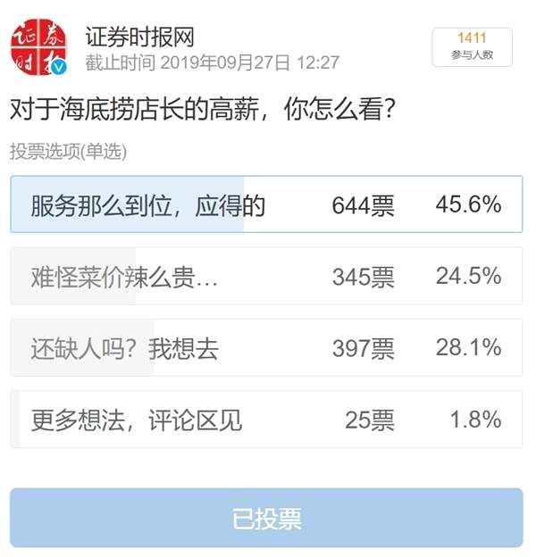 對于海底撈店長的高薪,的一項調(diào)查顯示,45%以上的網(wǎng)友認為“服務到位,店長應得。”