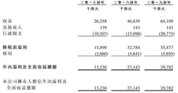 據(jù)招股書披露的財務數(shù)據(jù),雅利多金融的經(jīng)營情況良好,于2017財年、2018財年、2019財年的營業(yè)收入分別為2,625.8萬港元、4,663.9萬港元、6,410.9萬港元,同比增長77.62%、37.46%;凈利潤分別為1,323.0萬港元、2,714.3萬港元、2,978.2萬港元,同比增長105.16%、9.72%。