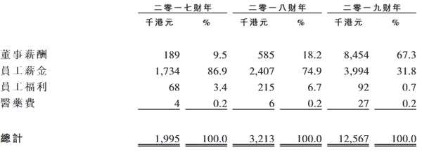 就成本層面來看,雅利多金融大幅增加雇員福利開支與傭金、經(jīng)紀及處理開支,無論是金額還是占比,均處于高位。而實際上,這筆開支大部分流入了董事的口袋,員工薪金的占比呈逐年遞減的狀態(tài)。