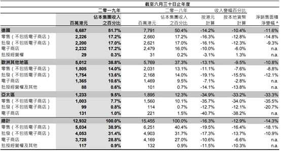 時間拉回2019年,思捷環(huán)球處境稍有改善。了解到,公司過去一年一直在關(guān)閉無盈利店鋪及優(yōu)化零售店鋪版圖,共計關(guān)閉了169間無盈利店鋪,此外14 間接受減租以及3 間減少面積,還有 20 間預(yù)期在下一財政年度執(zhí)行關(guān)閉或減租。目前總可控制面積已按年同比減少14.3%,導(dǎo)致最新財年營收同比下滑16.3%至129.32億元,如果刨除外匯影響的話下跌幅度是-12.9%。但是由于公司報告期的上半年還在清理舊庫存,導(dǎo)致公司整體毛利率同比下滑1個百分點至50.3%。