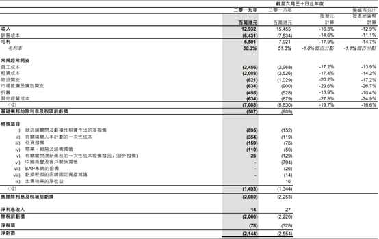 不過好在費用方面表現(xiàn)不錯,公司最終還是錄得虧損收窄。了解到,得以重組計劃,公司常規(guī)經(jīng)常開支中的員工成本、租賃成本、物流開支、市場推廣及廣告開支、折舊及其他經(jīng)營成本,分別同比下滑17.2%、17.4%、20.2%、29.6%、13.9%以及27.8%,70.88億元的常規(guī)經(jīng)常開支為較去年同期下滑19.7%,降幅均大于收入和毛利的降幅,因此公司基礎(chǔ)業(yè)務(wù)的除利息及稅項前虧損為5.87億元,較去年同期的9.09億虧損還是有較大改善的。