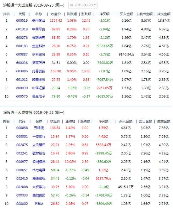 摘要: 9月23日消息,截至滬深股市收盤,北向資金凈流出15.31億元。今日凈買入平安銀行(000001,股吧)4.42億元、五糧液(000858)1.55億元,凈賣出貴州茅臺(600519,股吧)3.51億