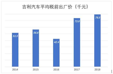 2014年吉利汽車出廠價不過5萬元出頭,是典型的低端產(chǎn)品;2016年回落到4.2萬元;2017年,帝豪GS、帝豪GL兩款“高端”熱銷(占到總銷量的41%),出廠價躥升至創(chuàng)紀(jì)錄的7.4萬元;2018年,領(lǐng)克杠起“高端”大旗,將出廠均價拉高到7.9萬元。