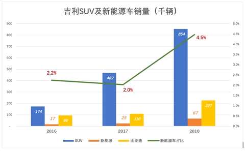 2018年,博越、遠(yuǎn)景、領(lǐng)克等SUV及“跨界”車型銷量達85.4萬輛,同比增長34%。新能源車只售出6.7萬輛,占比4.47%。