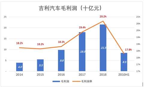 2018年吉利汽車銷量達到創(chuàng)紀(jì)錄的150萬輛,毛利潤率亦突破20%、金額達到215億元。2019年H1,毛利潤率大幅跌至17.8%,毛利潤85億元。