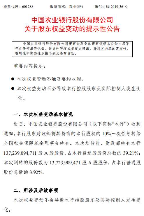 農(nóng)業(yè)銀行(601288)9月25日晚公告,近日,公司收到通知,股東財政部將其持有的公司股權的10%一次性劃轉(zhuǎn)給全國社會保障基金理事會持有。本次劃轉(zhuǎn)前,財政部持有農(nóng)行 1372.39億股A股股份,占農(nóng)行普通股股份總數(shù)的39.21%;本次劃轉(zhuǎn)的股份數(shù)為137.23億股A股股份,占農(nóng)行普通股股份總數(shù)的3.92%。