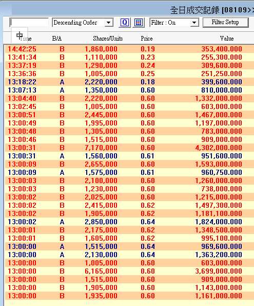 顏招駿表示:這是股票今天1分鐘走勢圖,早市時股票曾創(chuàng)出新高,然而在13:00分突然有80355000股成交了,觀察當(dāng)時的成交紀(jì)錄,這8千多萬股成交價主要都是在0.6港元,是在市場直接交收的。有人掛了個8千多萬的買盤,而同一時間有人在0.6沽給這個人。