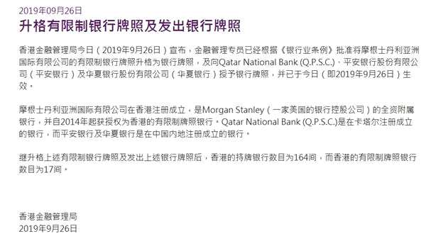 同時(shí)宣布的還有,將摩根士丹利亞洲國(guó)際有限公司的有限制銀行牌照升格為銀行牌照。