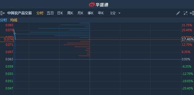 獲悉,中國農產品(000061,股吧)交易(00149)獲位元堂(00897)溢價44.44%提部分股份要約收購,受消息刺激早盤大幅高開,截至9時33分,漲17.46%,報價0.074港元,成交額821萬。