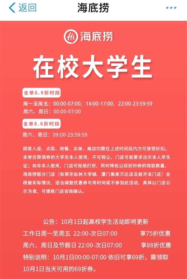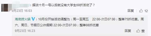 但10月1日后,海底撈將政策修改為周一到周五的22:00到次日的7:00大學(xué)生可享受7.5折優(yōu)惠,而周六周日的22:00到次日的7:00,只能享受到8.8折優(yōu)惠。相當于取消了下午場的優(yōu)惠,只有午夜場了,并且優(yōu)惠力度也有所降低。