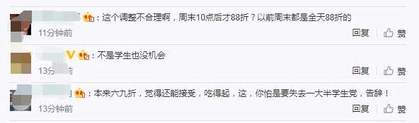 但海底撈近日宣布,10月1日后取消6.9折優(yōu)惠,取而代之的是工作日7.5折和周末8.8折優(yōu)惠,并且把時間限定在深夜至凌晨。大學(xué)生們紛紛表示,大學(xué)里有門禁,大半夜打折誰去吃?海底撈玩不起了嗎?