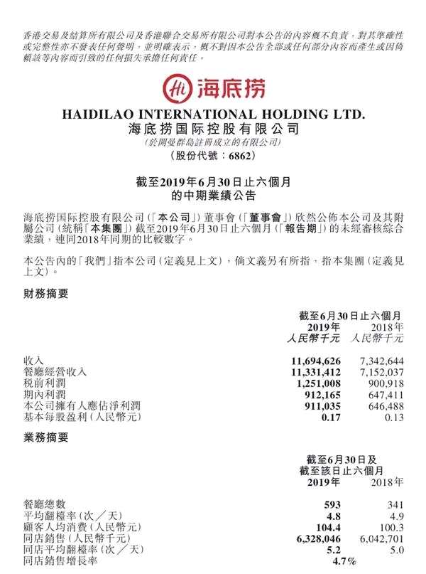 8月20日晚間,海底撈發(fā)布半年報,2019年上半年集團收入116.94億元,同比增長59.3%;營業(yè)利潤9.12億元,同比增長40.89%;公司股東應(yīng)占利潤9.11億元,同比增長40.92%,新開餐廳130家,門店總數(shù)增至593家。