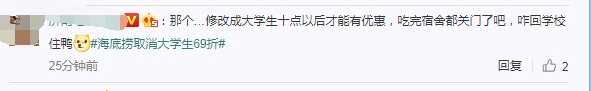 由于大學(xué)城一般都不在市中心,而海底撈一般都開在繁華商業(yè)區(qū),有6.9折的時候,學(xué)生群體才熱衷于從較為偏僻的大學(xué)城去“市中心”在海底撈聚餐一次。但改為午夜場后,深夜出行沒有公共交通,一來一回成本不低,此外女學(xué)生們還需要擔心安全因素。學(xué)生群體屬于價格敏感型客群,他們認為,經(jīng)過這次調(diào)整,海底撈可能是在變相趕客。