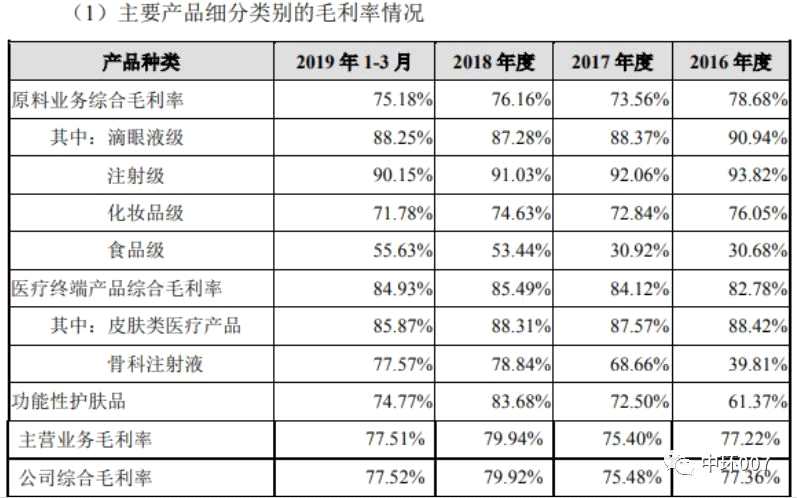 說(shuō)起醫(yī)美,這又是一個(gè)暴利且迅速增長(zhǎng)的行業(yè)。華熙生物收入從2013年的3.75億元增至2018年的12.63億元,年復(fù)合增長(zhǎng)率達(dá)到27.48%,毛利率常年在75%以上,甚至80%,凈利潤(rùn)率也經(jīng)常超過(guò)30%。當(dāng)然,同行中還有毛利率更高的公司,像愛美客、翰宇藥業(yè)(300199,股吧)等。外界給華熙生物貼上的標(biāo)簽是“玻尿酸龍頭”,確實(shí)沒錯(cuò),華熙生物是全球最大的玻尿酸原料生產(chǎn)商。