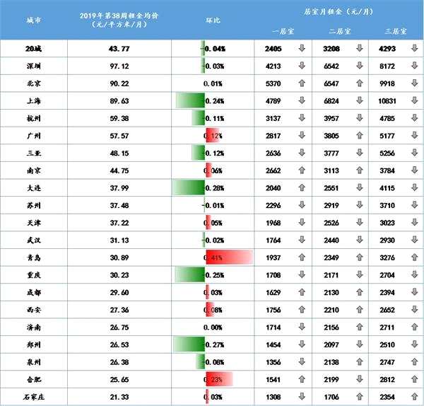 諸葛找房數(shù)據(jù)顯示,2019年第38周(9月16日至9月22日)全國大中城市租賃市場持續(xù)平穩(wěn)下行,租金均價為43.77元/平方米/月,環(huán)比微跌0.04%。截至第38周,租金價格已經(jīng)連續(xù)6周下跌,租賃熱度持續(xù)減退。分居室看,三居室下跌最嚴重,租金跌幅連續(xù)三周位居首位。