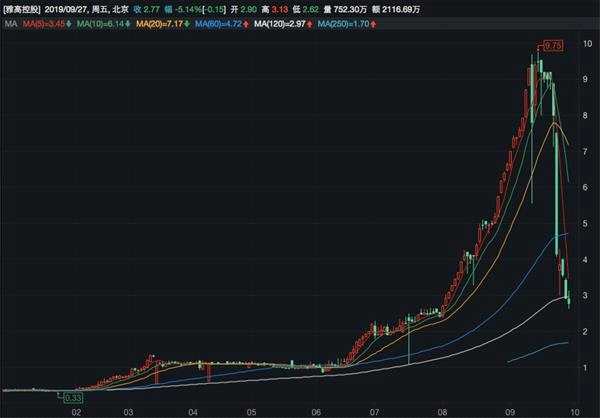 2019年9月26日,雅高控股開盤經(jīng)歷小幅反彈后重啟下跌模式,全天跌幅達(dá)17.98%,最終報(bào)收于2.92港元/股。27日,該股繼續(xù)走跌,當(dāng)日跌幅達(dá)5.14%,收于2.77港元/股。其最新85.83億港元的市值較十一個(gè)交易日前創(chuàng)出的52周歷史市值高點(diǎn)蒸發(fā)7成,但較52周的市值低點(diǎn)漲幅仍超過10倍。