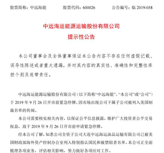 9月29日消息,中遠(yuǎn)海能(600026,股吧)表示:經(jīng)本公司了解,知悉公司全資子公司大連中遠(yuǎn)海運(yùn)油品運(yùn)輸有限公司已被美國財(cái)政部海外資產(chǎn)控制辦公室列入特別指認(rèn)國民和被禁阻者名單。本公司正全面梳理各項(xiàng)業(yè)務(wù),評估相關(guān)影響,努力做好各項(xiàng)應(yīng)對工作,股票9月30日復(fù)牌。此外,中遠(yuǎn)海能H股自26日起停牌,目前并未發(fā)布相關(guān)進(jìn)展公告。