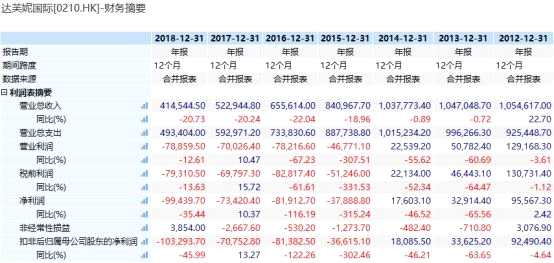 2013年的財(cái)務(wù)數(shù)據(jù)顯示,達(dá)芙妮開始由營(yíng)收同比增長(zhǎng)轉(zhuǎn)為連年下降,2013年當(dāng)年?duì)I業(yè)收入為104.70億港元,同比微跌0.72%,但2015年-2018年?duì)I業(yè)收入同比降幅分別達(dá)到18.96%、22.04%、20.24%、20.73%;同時(shí),2015年該公司更是陷入業(yè)績(jī)虧損的泥沼,凈利潤(rùn)當(dāng)年虧損3.79億港元,隨后幾年虧損更是擴(kuò)大至8.19億港元、7.34億港元和9.94億港元。