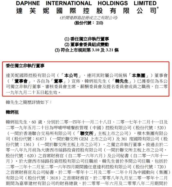 公開資料顯示,韓炳祖此前曾擔(dān)任過(guò)呷哺呷哺餐飲管理(中國(guó))控股有限公司、積木集團(tuán)有限公司及361度國(guó)際有限公司的獨(dú)立非執(zhí)行董事,以及Kappa母公司中國(guó)動(dòng)向(集團(tuán))有限公司的首席財(cái)務(wù)官。