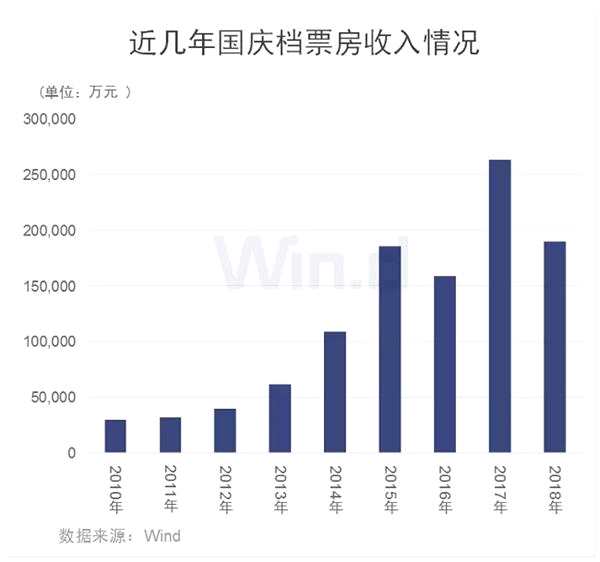 Wind統(tǒng)計顯示,2010年至2015年,國慶檔票房呈現(xiàn)快速增長的態(tài)勢,從2010年的3億元增長至2015年的超過18億元,而近幾年國慶檔票房則出現(xiàn)較大的波動,2018年國慶檔不足20億元,較2017年國慶檔的26億元下滑超過20%。