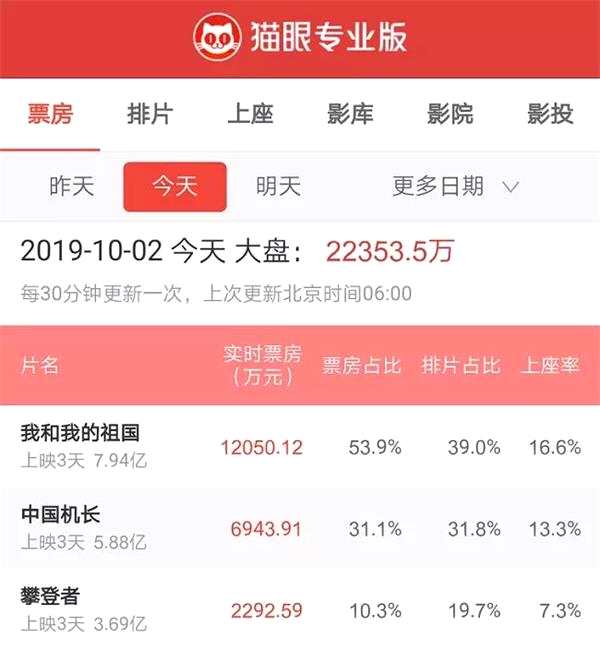 摘要: 9月30日,《我和我的祖國》《中國機(jī)長》《攀登者》三部主旋律影片同日上映,由于不管是題材還是陣容都堪稱“頂配”,今年國慶電影檔也有“最強(qiáng)國慶檔”之稱。截至10月2日6:00,三部影片票房累計已經(jīng)達(dá)17