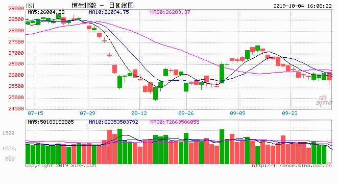 10月4日消息,美股周四逆轉收高,主要股指結束了前兩日連續(xù)重挫的行情。美國9月ISM服務業(yè)活動指數創(chuàng)三年新低,表明美國經濟放緩風險增大,同時也強化了市場對美聯(lián)儲在10月會議上再次降息的預期。今日開盤,港股恒指高開0.23%,隨后跌幅擴大,失守26000點,午后一度跌近2%。截止收盤,恒生指數跌1.11%,報25821.03點;國企指數跌0.72%,報10147.33點;紅籌指數跌0.53%,報4145.78點。