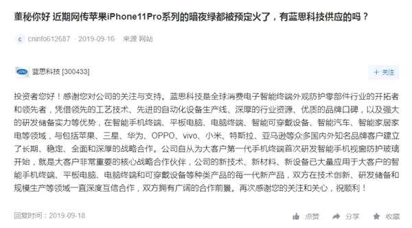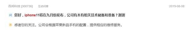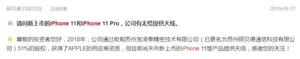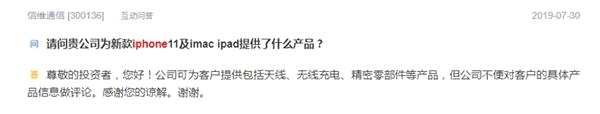 中證君注意到,自從iPhone11發(fā)布前后,就有投資者不斷在互動易平臺咨詢藍(lán)思科技、信維通信、歐菲光、鵬鼎控股、百邦科技等蘋果產(chǎn)業(yè)鏈公司與iPhone11 系列的業(yè)務(wù)關(guān)系。