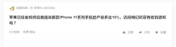 在A股市場,雖然目前處于假期休市期間,但也有投資者第一時間在互動平臺緊跟這一行業(yè)熱點。某投資者就咨詢蘋果供應(yīng)商歐菲光,“蘋果已經(jīng)告知供應(yīng)商提高新款iPhone 11系列手機的產(chǎn)量多達(dá)10%。請問歐菲光有收到通知嗎?”