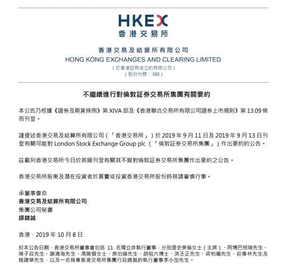 國(guó)慶節(jié)后第一天10月8日早間,港交所發(fā)布公告稱,盡管與眾多監(jiān)管機(jī)構(gòu)以及大量股東接洽,港交所董事會(huì)對(duì)于未能說(shuō)服倫交所管理層認(rèn)同未來(lái)愿景感到失望,為了港交所股東的最佳利益,港交所董事會(huì)決定不再繼續(xù)對(duì)倫交所的要約收購(gòu)程序。