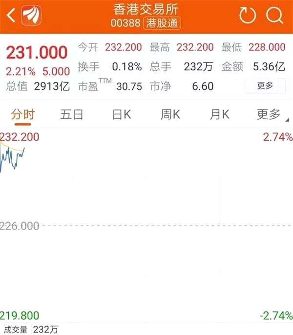 在10月8日港交所宣布不再對(duì)倫交所進(jìn)行要約收購(gòu)后,港交所股價(jià)大幅上漲,開(kāi)盤229.4港元/股,漲1.5%,盤中一度漲近3%,截至發(fā)稿,港交所股價(jià)為231港元/股,上漲2.21%。