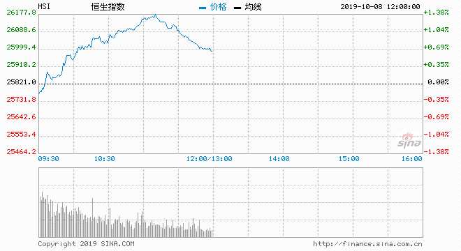 摘要: 10月8日消息,美股周一震蕩收跌。市場(chǎng)正關(guān)注國(guó)際貿(mào)易局勢(shì)的進(jìn)展、美聯(lián)儲(chǔ)官員講話以及經(jīng)濟(jì)數(shù)據(jù)。今日開(kāi)盤(pán),港股恒指高開(kāi)0.11%,隨后一度漲逾1%,重返26000點(diǎn)。截至午間收盤(pán),恒生指數(shù)漲0.67%,報(bào)