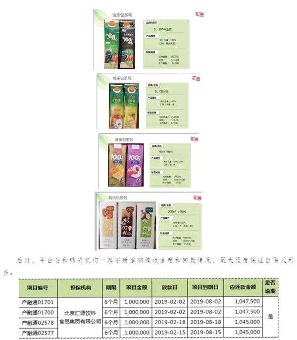這四家公司在“工場微金”的借款項目總金額為400萬元,還款日為8月初至8月中旬,此時均已逾期,為了償還債務(wù),四家公司選擇以匯源果汁抵債。
