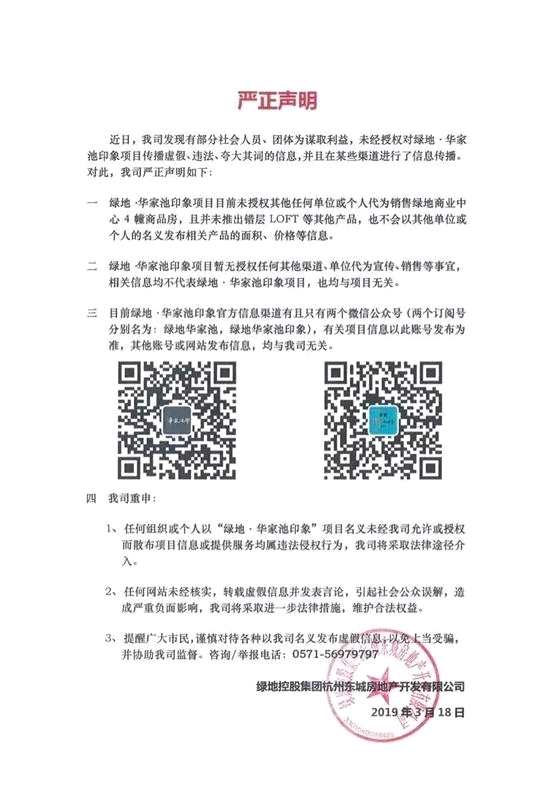 不過,2019年3月份時,綠城杭州東城房地產(chǎn)在“綠地華家池印”官微上發(fā)布了一則聲明稱,該項目“目前未授權(quán)其他任何單位或個人代為銷售綠地商業(yè)中心4幢商品房”、“暫無授權(quán)任何其他渠道、單位代為宣傳、銷售等事宜”。
