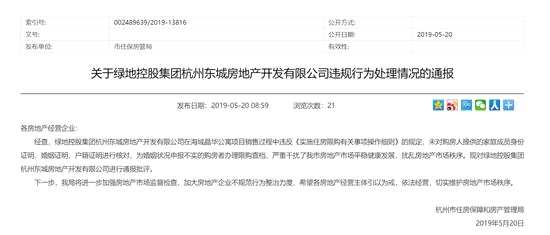 2019年5月份,綠城杭州東城房地產(chǎn)因在華家池印項目的銷售中出現(xiàn)違規(guī)而遭到通報。