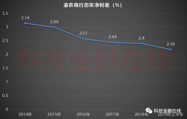 據(jù)科技金融在線統(tǒng)計(jì)發(fā)現(xiàn),2014年,渝農(nóng)商行凈利差為3.14%,次年便降至3%以下,至2019年上半年,渝農(nóng)商行的凈利差已降至2.18%。