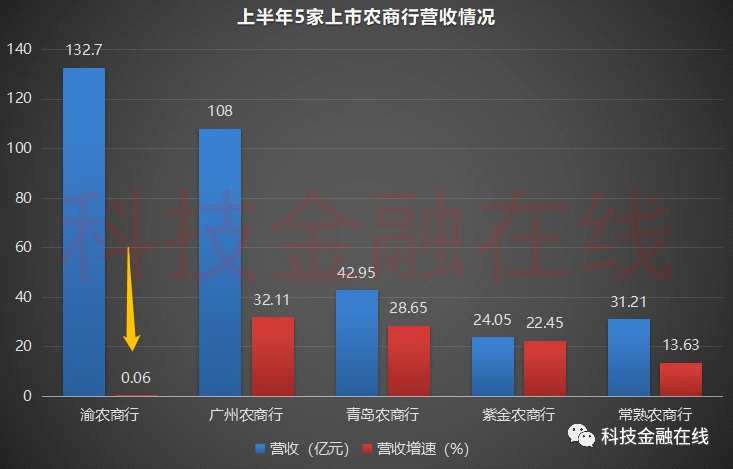 從數(shù)據(jù)來看,上半年渝農(nóng)商行的營收增速僅為0.06%,幾乎處于停滯狀態(tài)。若對比同類銀行中其它4家上市農(nóng)商行上半年的營收情況,盡管渝農(nóng)商行因體量原因營業(yè)收入排在第一,但其營業(yè)收入的增速卻在5家農(nóng)商行中處于墊底。
