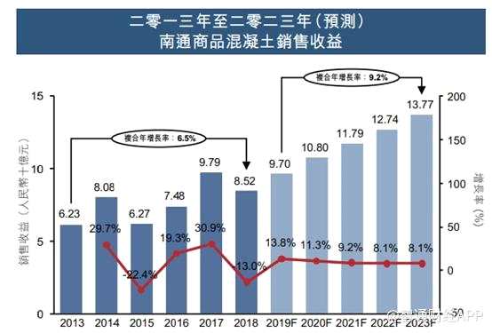 據(jù)招股書披露,2013年至2018年,按產量計,南通市商品混凝土年復合增長1.4%達到20.65百萬立方米,據(jù)預測未來五年年復合增長4.5%;按收益計,年復合增長6.5%達到85.2億元,預計未來五年年復合增長9.2%。