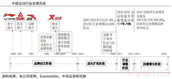 港股體育用品行業(yè)主要包括安踏、李寧、361度以及特步國際。中國運動行業(yè)發(fā)展歷史如下: