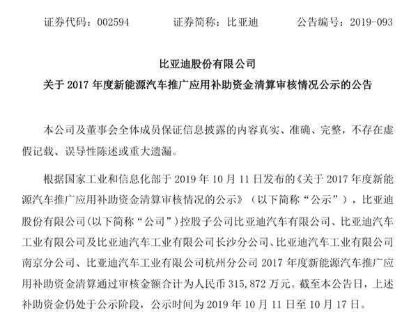 10月15日,比亞迪股份有限公司(下稱“比亞迪”)發(fā)布公告稱,根據(jù)工信部《關(guān)于 2017 年度新能源汽車推廣應(yīng)用補(bǔ)助資金清算審核情況的公示》,比亞迪旗下四家控股子公司2017年度新能源汽車推廣應(yīng)用補(bǔ)助資金清算通過審核金額合計(jì)為人民幣31.58億元。