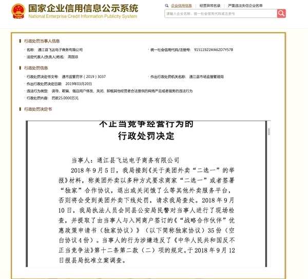 事實(shí)上,美團(tuán)點(diǎn)評(píng)因?yàn)樵撔袨?,受到的工商行政處罰也不止一次。國家企業(yè)信用信息公示系統(tǒng)顯示,早在2018年3月,四川省巴中市通江縣市場(chǎng)監(jiān)督管理局接到舉報(bào),稱美團(tuán)點(diǎn)評(píng)運(yùn)營主體“北京三快科技有限公司”涉嫌強(qiáng)制商家“二選一”,9月份對(duì)其進(jìn)行立案調(diào)查,2019年3月對(duì)其作出罰款25萬元的決定。