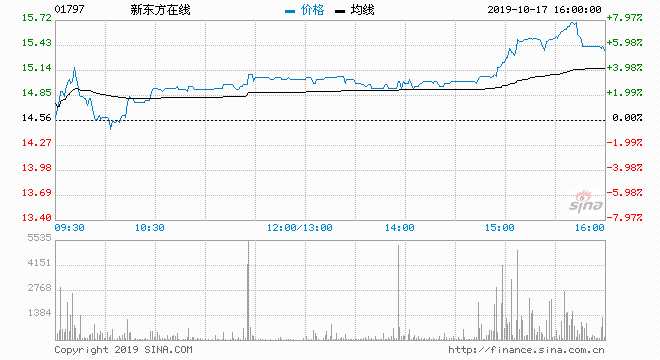 10月17日消息,新東方在線創(chuàng)上市新高,最高見15.2港元,現(xiàn)漲2.61%,報14.94港元,暫成交7376萬港元,總市值140億港元。