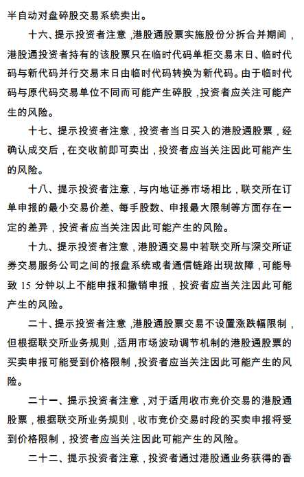 十八、提示投資者注意,投資者當(dāng)日買入的港股通股票,經(jīng)確認(rèn)成交后,在交收前即可賣出,投資者應(yīng)當(dāng)關(guān)注因此可能產(chǎn)生的風(fēng)險(xiǎn)。