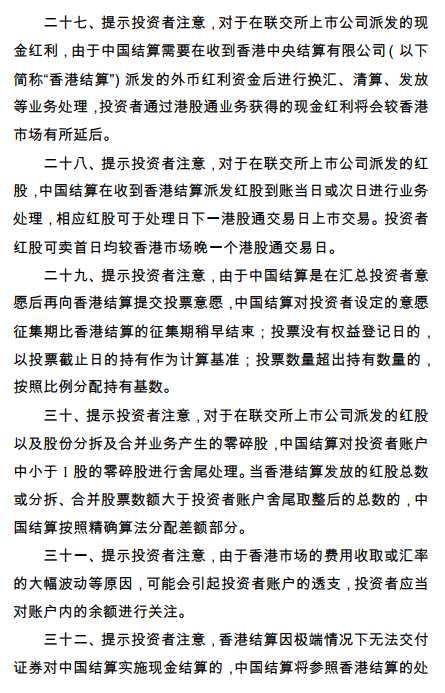 二十八、提示投資者注意,對(duì)于在聯(lián)交所上市公司派發(fā)的現(xiàn)金紅利,由于中國(guó)結(jié)算需要在收到香港結(jié)算派發(fā)的外幣紅利資金后進(jìn)行換匯、清算、發(fā)放等業(yè)務(wù)處理,投資者通過(guò)港股通業(yè)務(wù)獲得的現(xiàn)金紅利將會(huì)較香港市場(chǎng)有所延后。