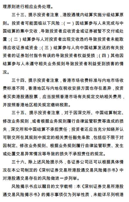 三十五、提示投資者注意,香港市場(chǎng)收費(fèi)標(biāo)準(zhǔn)與內(nèi)地市場(chǎng)收費(fèi)標(biāo)準(zhǔn)不同,香港地區(qū)與內(nèi)地在稅收安排方面也存在差異,投資者買賣港股通股票,應(yīng)當(dāng)按照香港市場(chǎng)有關(guān)規(guī)定交納相關(guān)費(fèi)用,并按照香港地區(qū)相關(guān)規(guī)定繳納稅款。