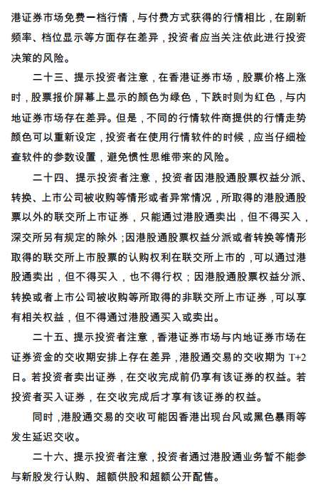 二十三、提示投資者注意,投資者通過(guò)港股通業(yè)務(wù)獲得的香港證券市場(chǎng)免費(fèi)一檔行情,與付費(fèi)方式獲得的行情相比,在刷新頻率、檔位顯示等方面存在差異,投資者應(yīng)當(dāng)關(guān)注依此進(jìn)行投資決策的風(fēng)險(xiǎn)。