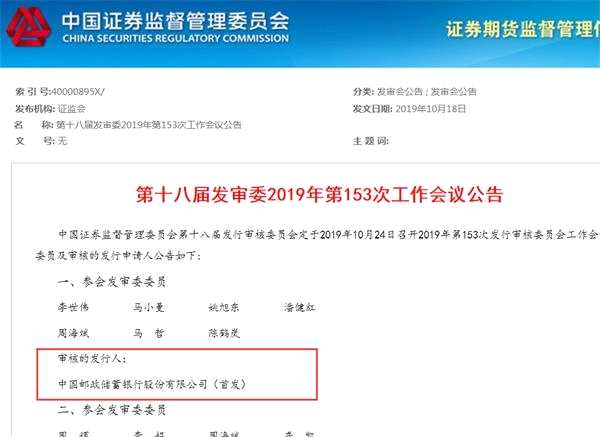 10月18日,證監(jiān)會發(fā)布公告稱,第十八屆發(fā)行審核委員會定于10月24日召開2019年第153次、第154次發(fā)行審核委員會工作會議,審核中國郵政儲蓄銀行股份有限公司(下稱郵儲銀行)等5家公司首發(fā)事項。這意味著這家“最年輕”的國有大型商業(yè)銀行,回歸A股之路“再進(jìn)一步”。