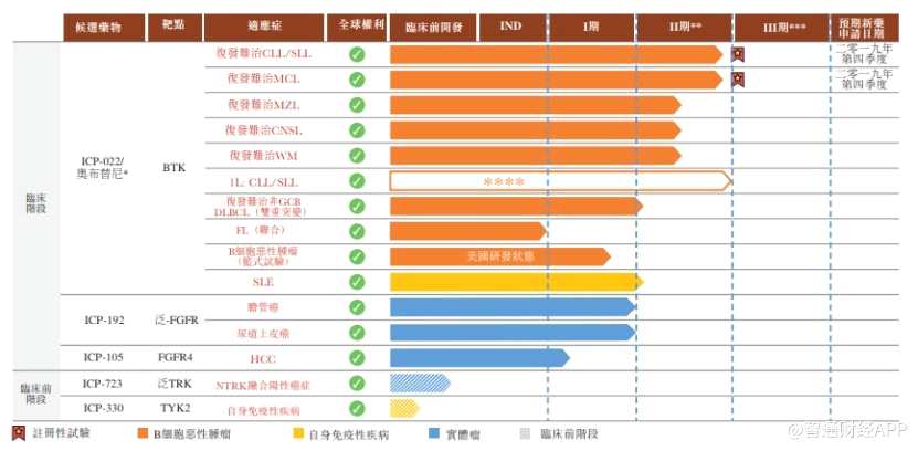 公司核心產(chǎn)品包括BTK抑制劑奧布替尼(ICP-022)、泛-FGFR抑制劑(ICP-192)、FGFR4抑制劑(ICP-105)、泛TRK抑制劑(ICP-723)和TYK2抑制劑(ICP-330),其中進展最快的是奧布替尼(ICP-022)。據(jù)了解,該項目共有10種適應(yīng)癥在研,復(fù)發(fā)難治CLL/SLL和復(fù)發(fā)難治套細胞淋巴瘤(MCL)適應(yīng)癥已處在II期注冊性試驗階段,預(yù)期將于今年年底向國家藥監(jiān)局(NMPA)提交新藥申請。