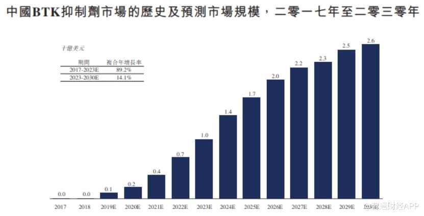 了解到,近年來BTK抑制劑在中國市場發(fā)展前景較為廣闊。據(jù)預(yù)測,2017-2023年,國內(nèi)BTK抑制劑市場復(fù)合增長率高達89.2%,或?qū)⒃?023年達到10億美元的市場規(guī)模,到2030年達到26億美元的市場規(guī)模。