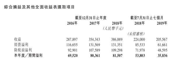 截至2016年、2017年、2018年及截至2019年7月31日止七個月,公司的收益分別約為2.88億元、3.54億元、3.87億元、及2.05億元。同期溢利分別約為6952萬元、8036萬元、8150萬元及3583萬元。